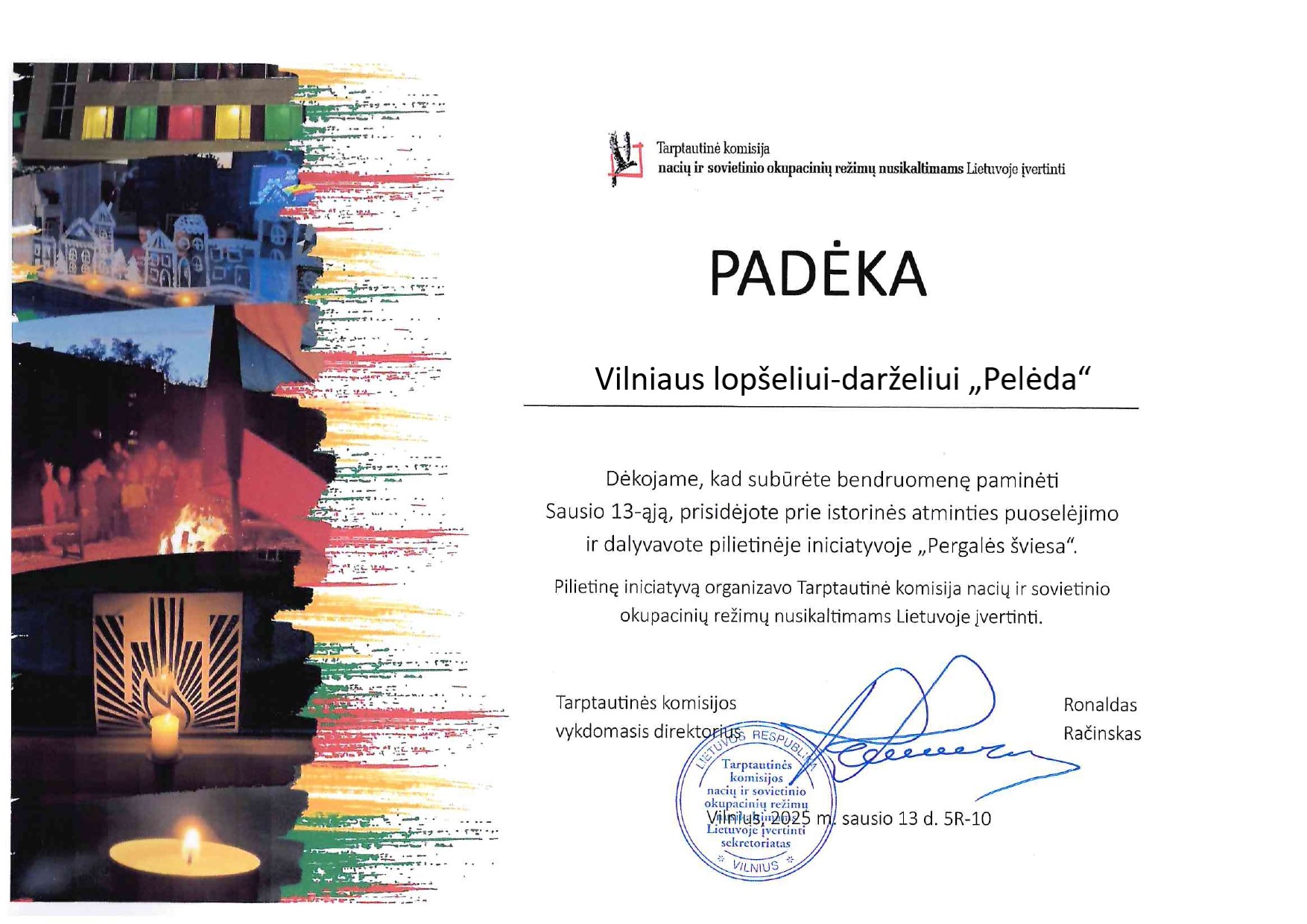 Padėka už dalyvavimą pilietinėje iniciatyvoje „Pergalės šviesa“.