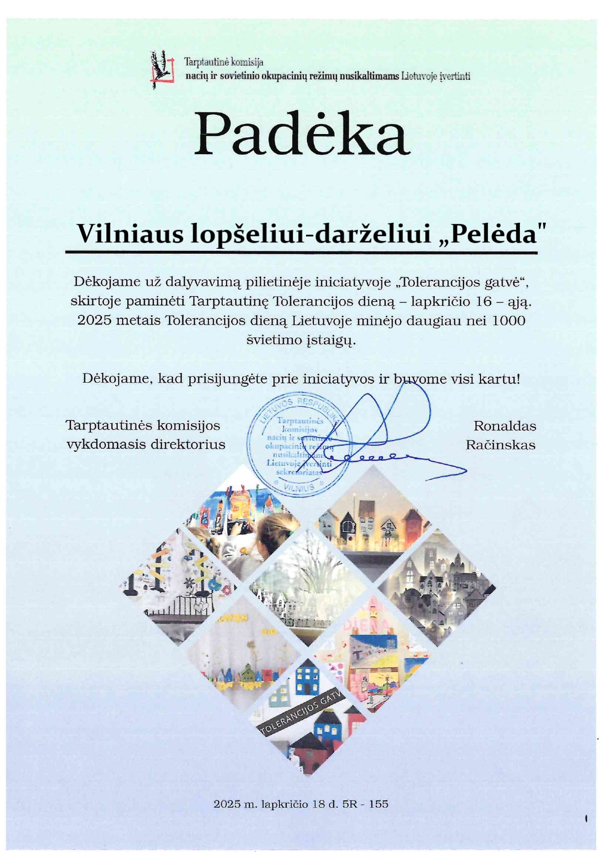Padėka už dalyvavimą pilietinėje iniciatyvoje „Tolerancijos gatvė”, skirtoje paminėti tarptautinę tolerancijos dieną.
